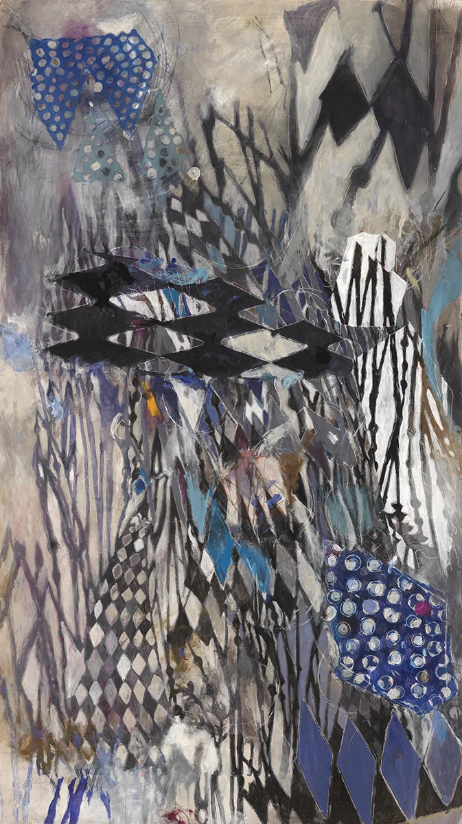 Fradkin uses color and pattern in her paintings to evoke emotion to tell stories of daily life and to draw the viewer into an intimate world. In many of her works, she incorporates collaged decorative elements, sourced from old catalogs, field guides, and vintage books. By meticulously cutting and pasting significant motifs and images, she develops intricate designs, rendering her surfaces more distinctive and her works as a whole more visually complex.